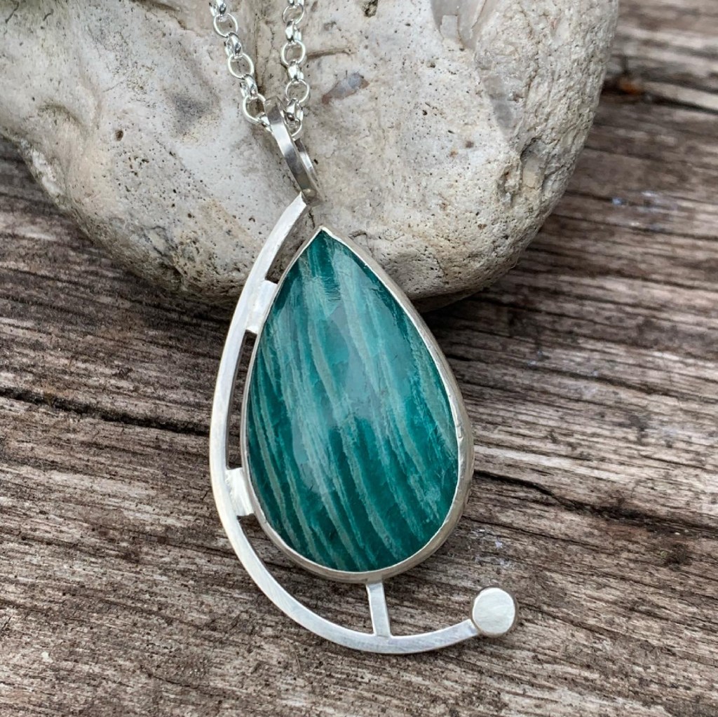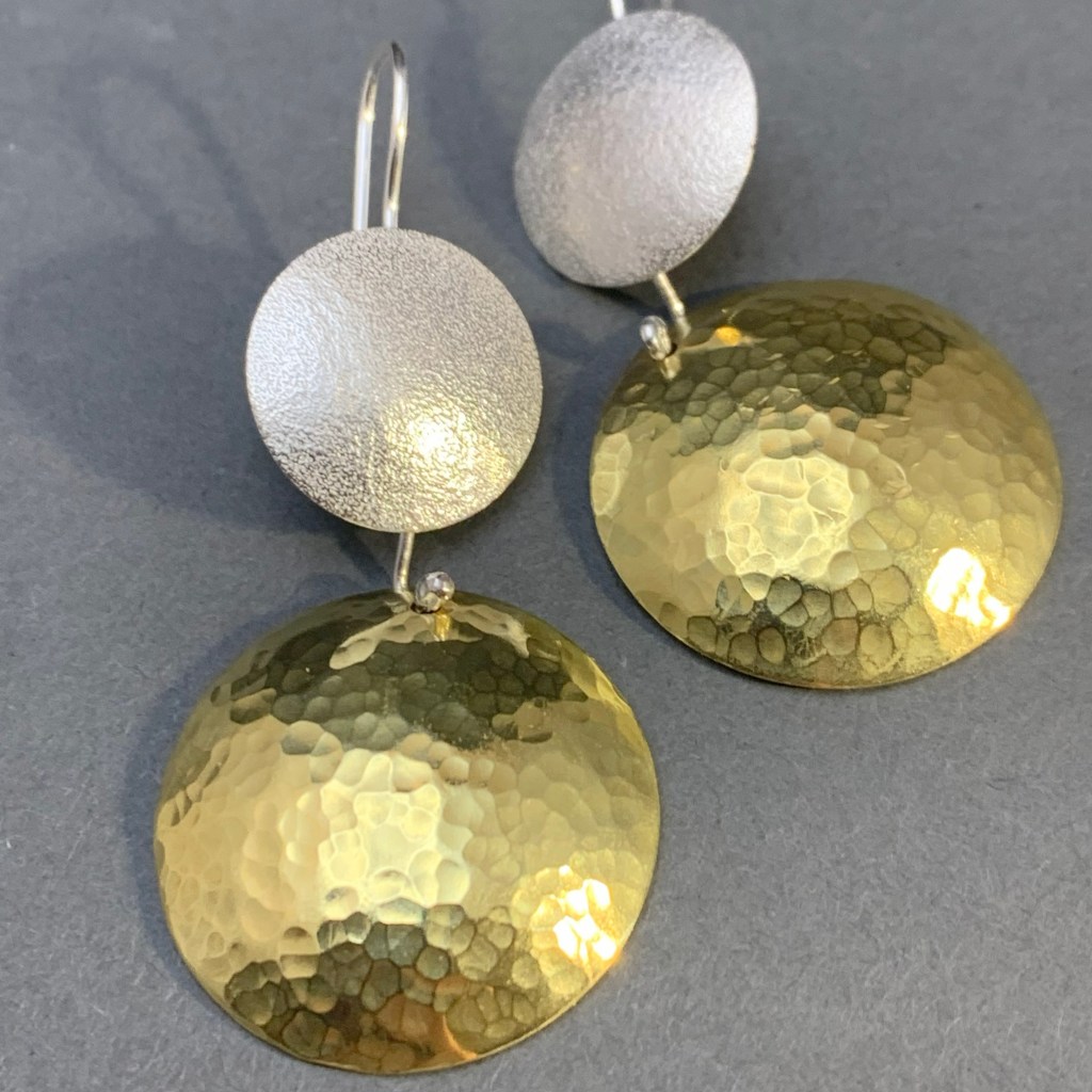 She takes inspiration from both organic and geometric shapes, employing a variety of hammering techniques and using textures from leaves or rocks. She loves to engineer movement into her designs.