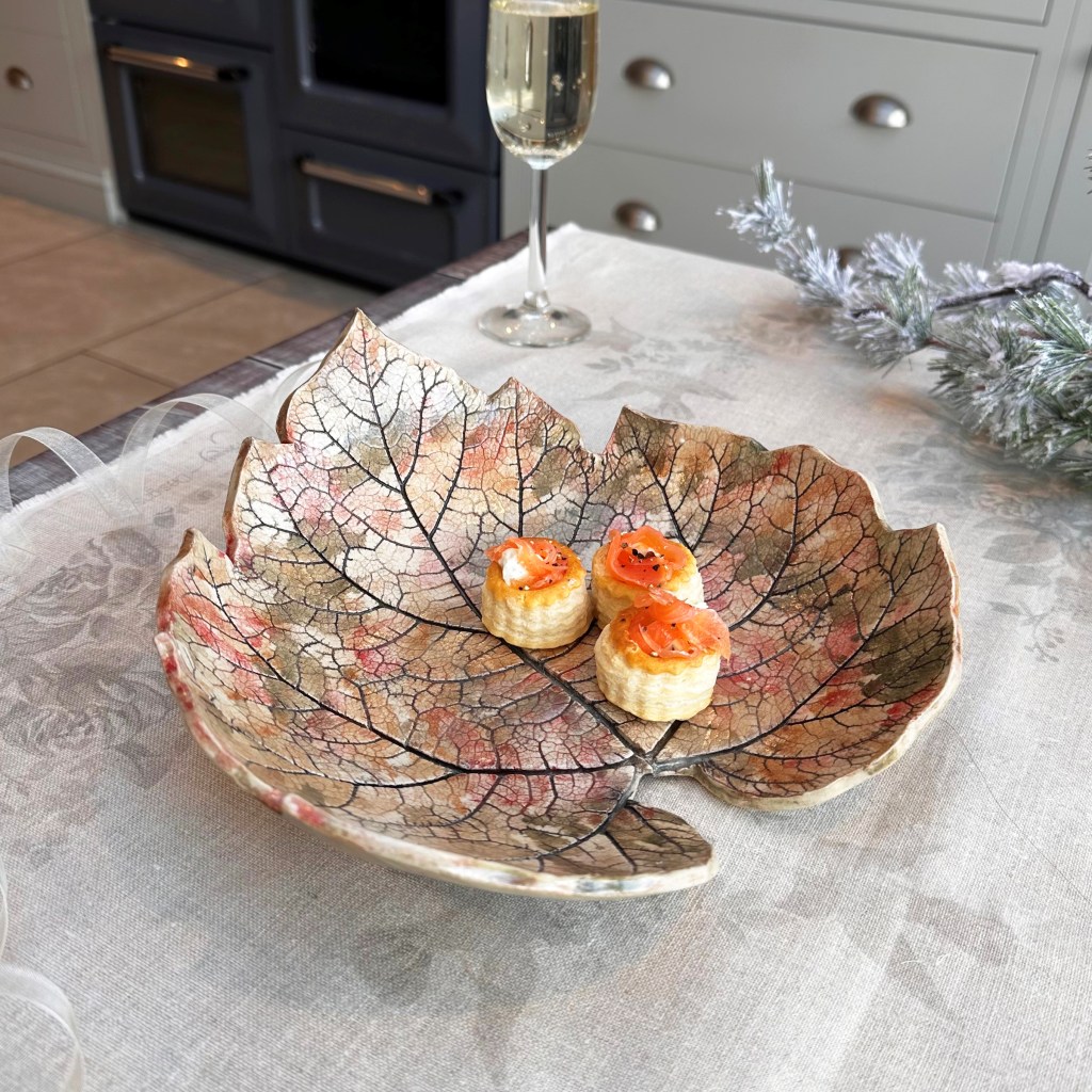 Her elegant ceramic leaf dishes are a reflection of her love of the great outdoors and the natural world. Each leaf dish is made from an individual leaf found in her garden or on walks with Rafa. The leaf dishes are finished by using a unique combination of oxides, stains and glazes applied in a variety of ways, giving each one its own individual character.
